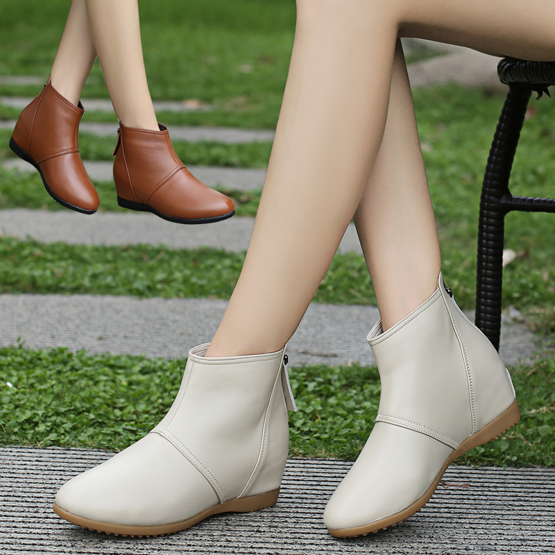 2025秋冬季短靴 平底中筒单靴 内增高米白色全真皮女靴子加绒坡跟