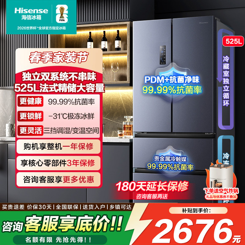 海信真空保鲜526L大容量双系统冰箱法式四开门一级家用换新补贴