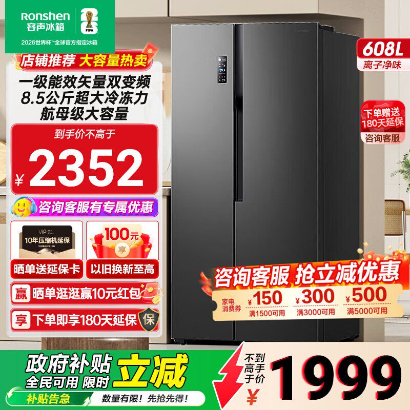 【政府补贴】容声608L双开门无霜家用电冰箱对开门大容量一级变频