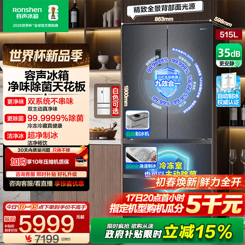 容声方糖515L机皇双净双系统自动制冰法式四开门家用嵌入式电冰箱