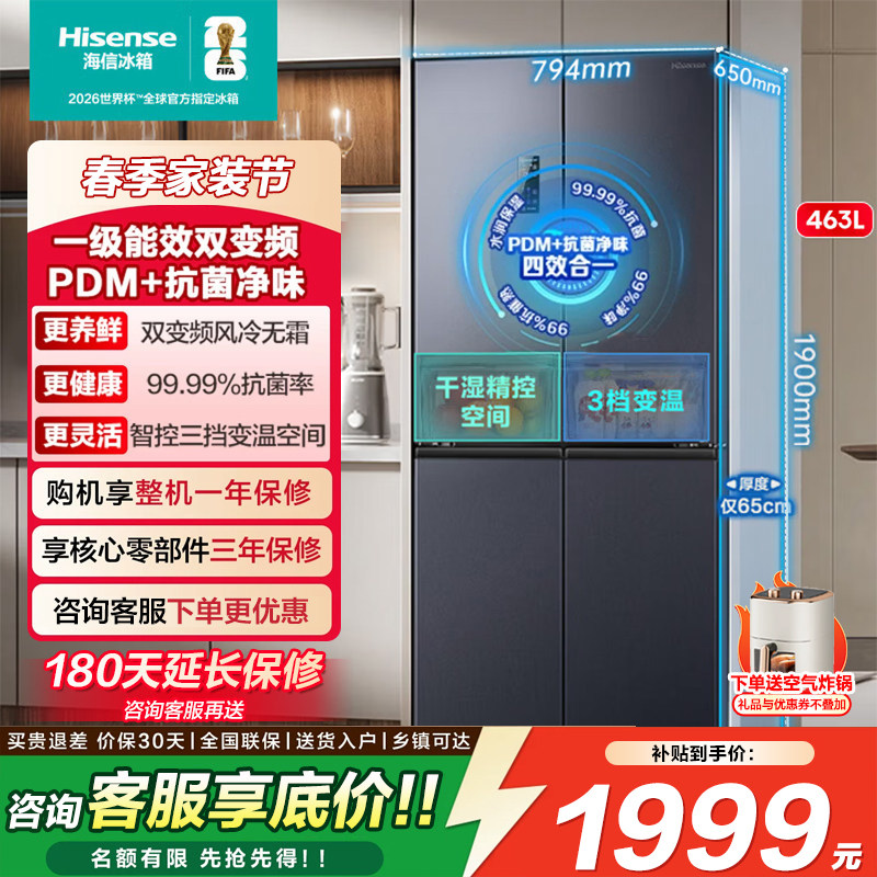 海信463升双变频1级能效除菌净味风冷无霜十字四开门省电冰箱家用