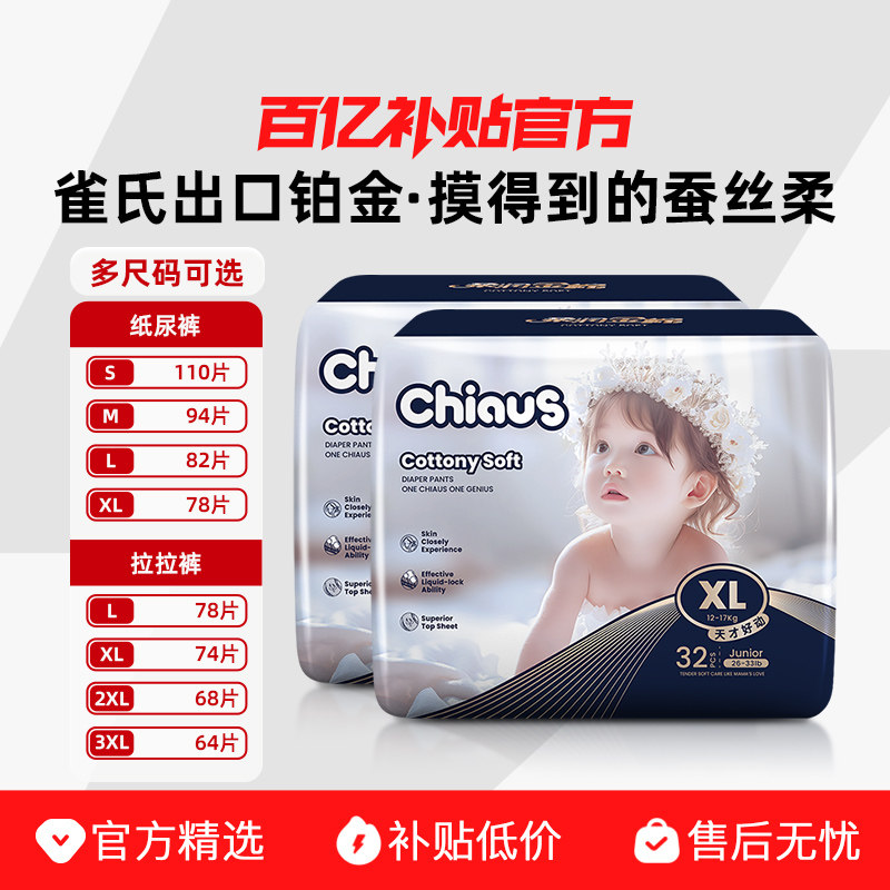 【真蚕丝添加】雀氏出口铂金装婴儿纸尿裤透气NB-6XL拉拉裤2包/组