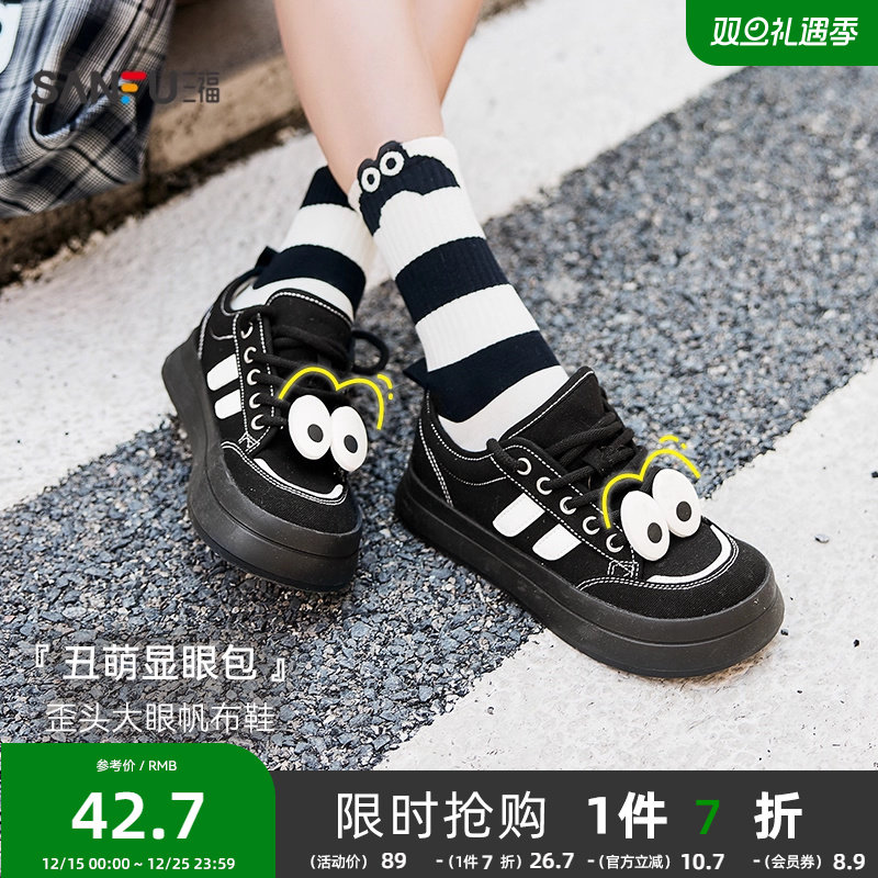三福女低帮板鞋春季显眼包歪头可拆卸大眼帆布鞋女鞋829127