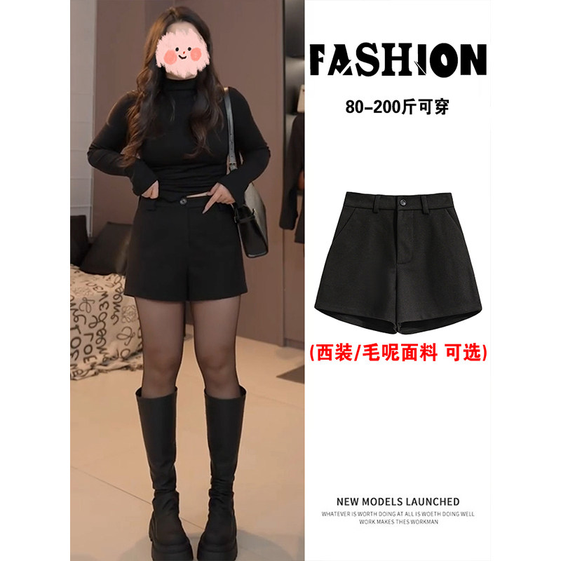 黑色毛呢西装短裤女秋冬大码小个子显瘦高腰宽松a字外穿阔腿靴裤