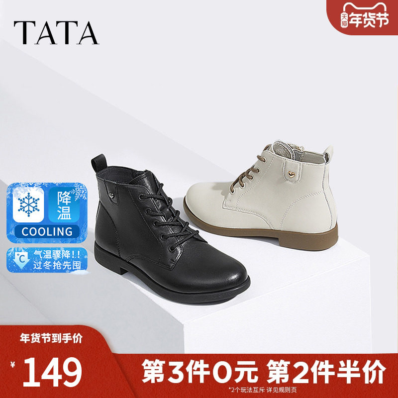 TATA他她休闲马丁靴女靴真皮简约平底短靴子2024冬季新款7BJ48DD4