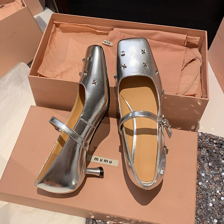 2024新品真皮牛皮单鞋女水钻金属扣方头中跟细跟脚面绑带银色洋气