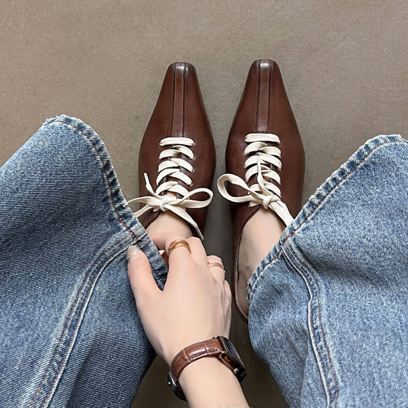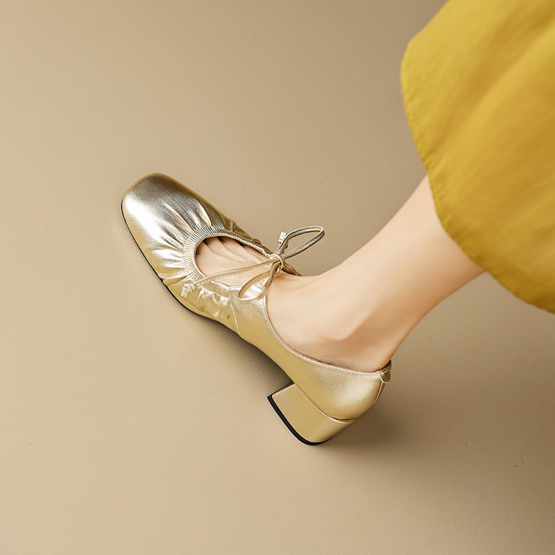 2026新款真皮法式复古尖头交叉绑带浅口单鞋女中跟玛丽珍鞋百搭