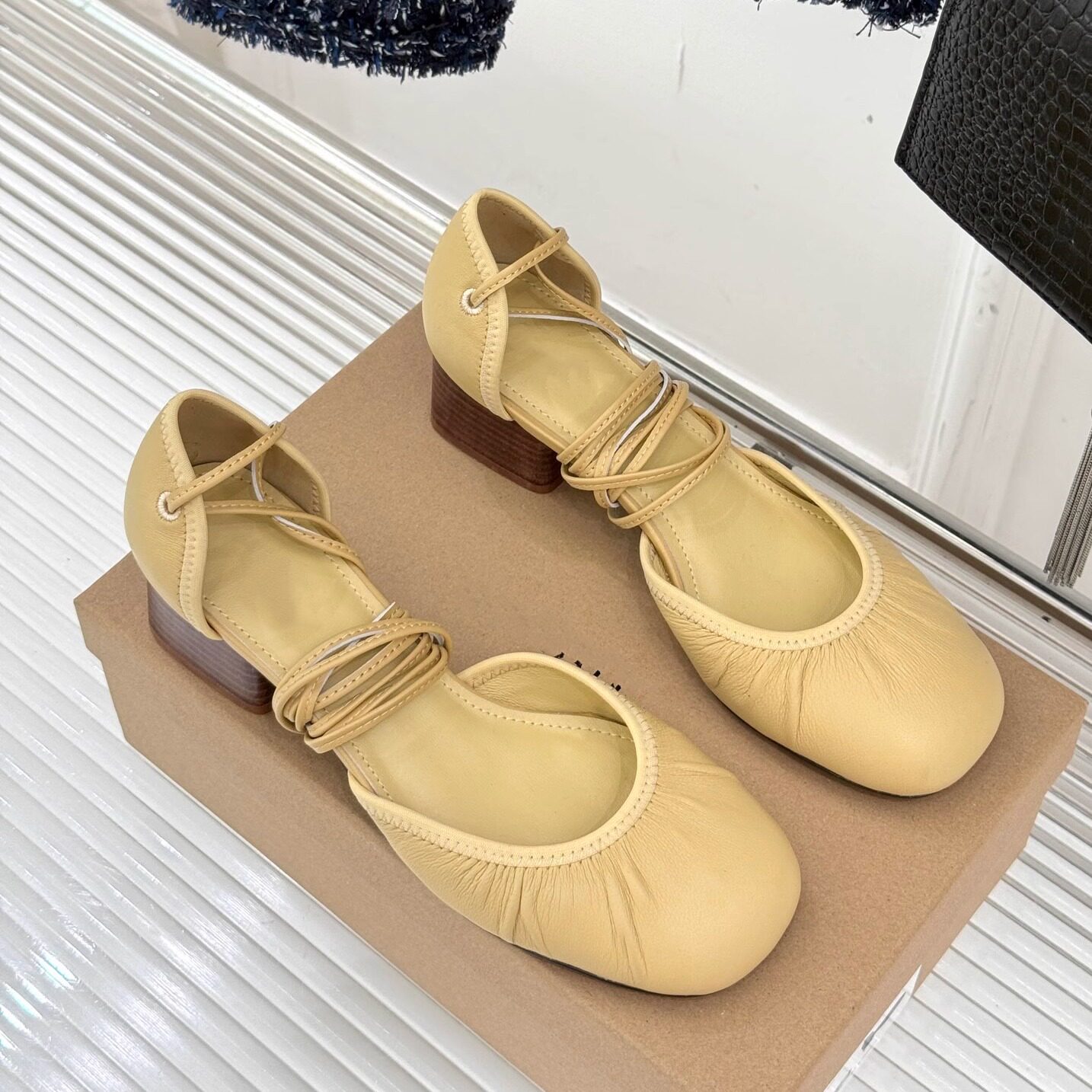 意大利mischa 2024水洗亚麻新款外穿芭蕾舞鞋 中跟交叉绑带单鞋女