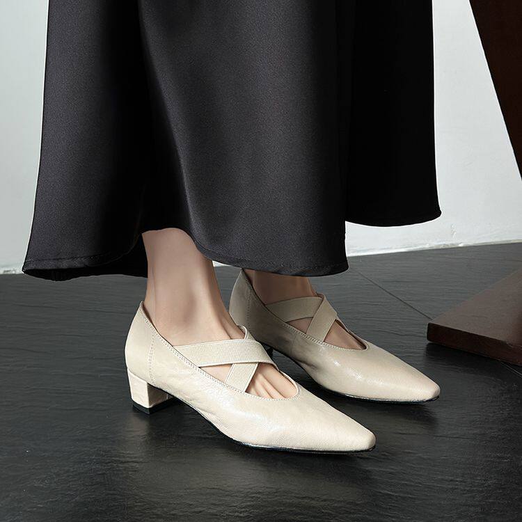 2024年新款粗跟方头法式罗马交叉绑带杏色芭蕾鞋玛丽珍中跟单鞋女