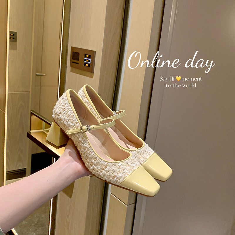 新品方头单鞋女拼色中跟粗跟脚面绑带韩版低帮鞋百搭气质搭扣女式
