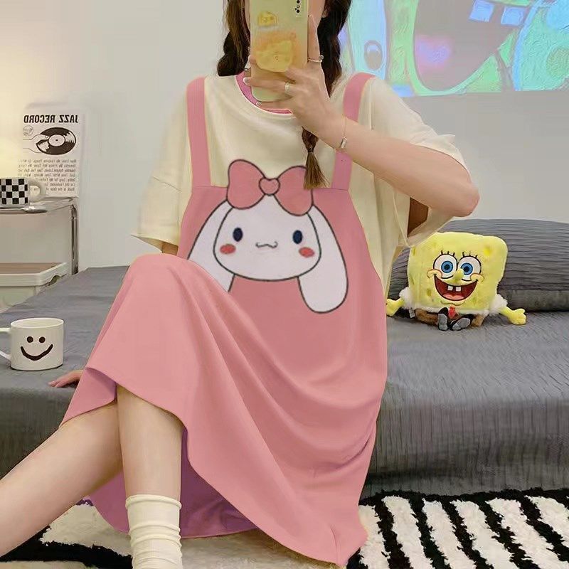 睡裙女春夏季短袖纯棉卡通甜美孕妇中裙薄款睡衣夏天可外穿家居服
