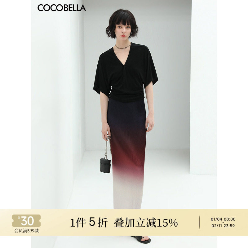 [断码清仓]COCOBELLA渐变晕染压褶半身长裙吊染风百褶筒裙HS540