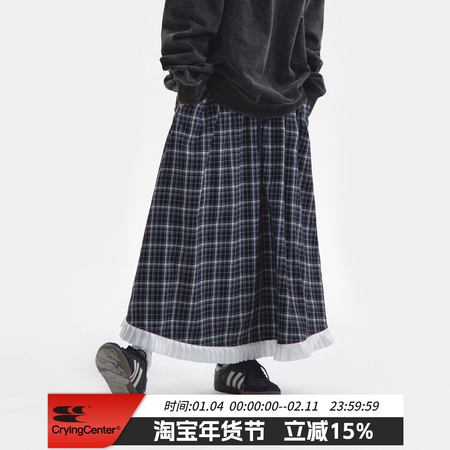 CryingCenter复古学院风格纹拼接花边伞裙半身长裙橡筋腰哭喊中心