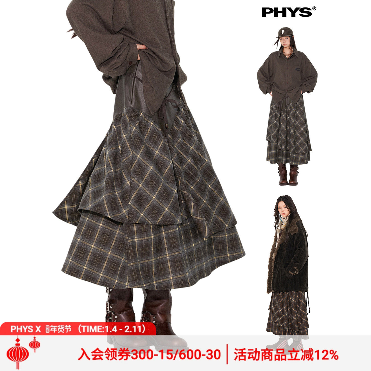 尺尺间Lsland 复古格纹多层撞色蛋糕半身裙女秋季新款设计感长裙