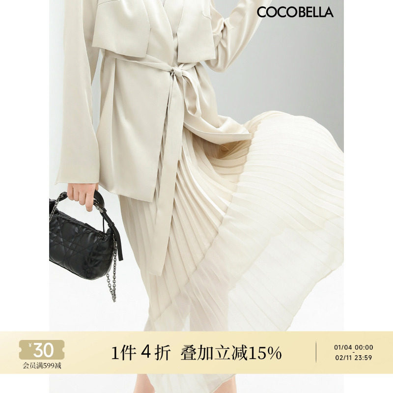[品牌特卖]COCOBELLA设计感拼接缎面百褶裙不对称半身长裙HS535