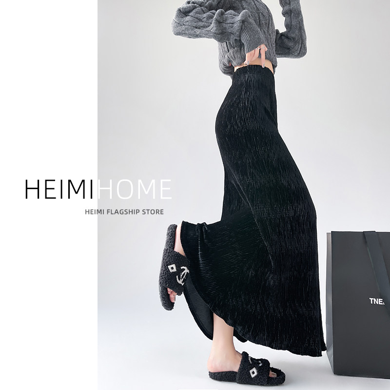 黑色金丝绒鱼尾裙女秋冬肌理感高级a字包臀裙中长款褶皱半身长裙