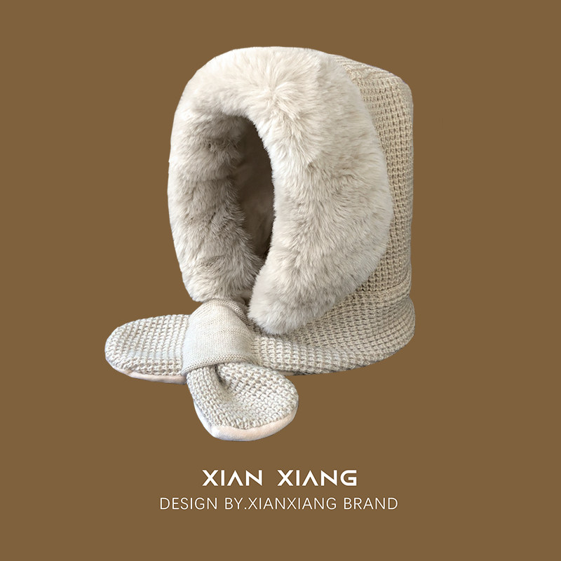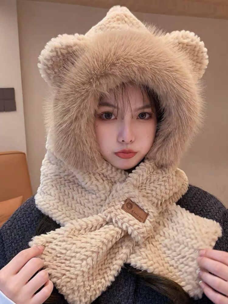 小熊耳朵帽子围巾一体女冬季保暖百搭防风加绒加厚毛绒围脖雷锋帽