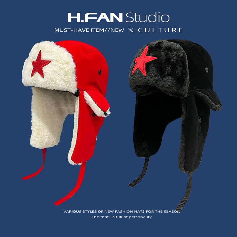 国潮红色星星冬季雷锋帽户外骑行出游保暖护耳飞行棉帽东北防寒帽