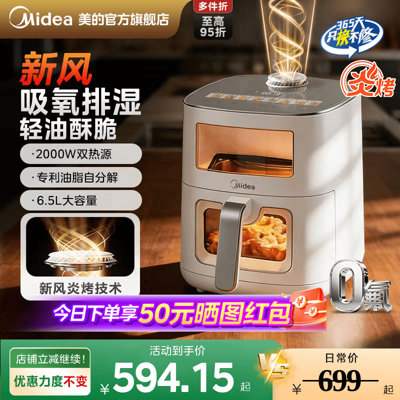 美的炎烤空气炸锅智能大容量空气炸电薯条机电烤箱[下拉详情优惠]
