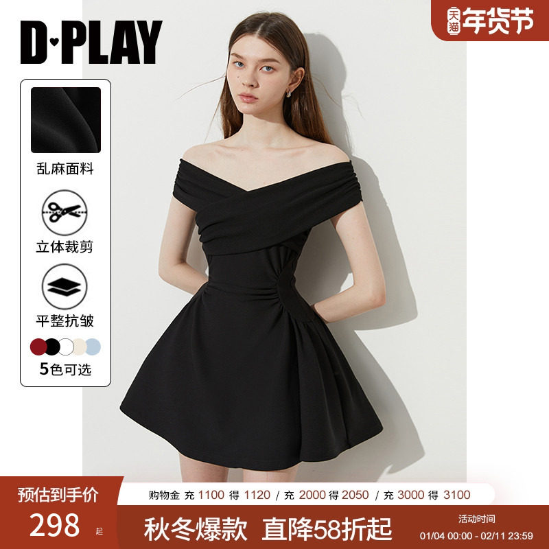 DPLAY2025年夏季新款气质黑色一字肩连衣裙女短款礼服裙子短裙