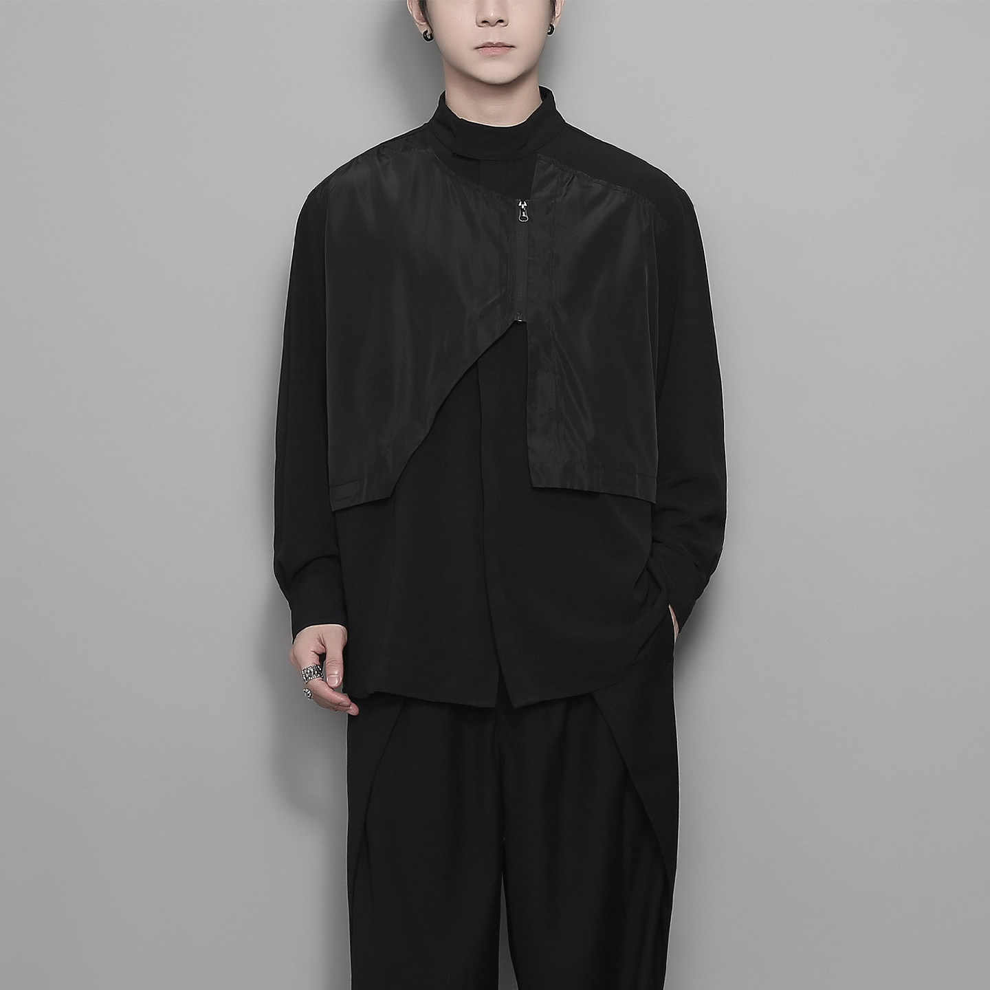 潮男原创秋季暗黑港风个性不规则几何拼接拉链设计长袖衬衫男上衣