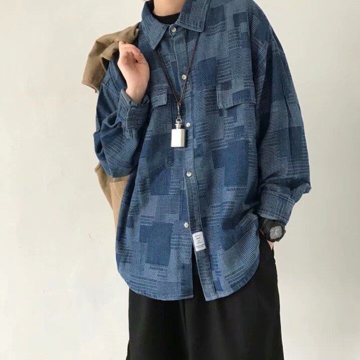特林露日系复古几何图案撞色拼接衬衫外套男秋季宽松休闲衬衣潮男