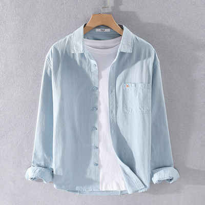 秋季简约男士长袖衬衫宽松纯棉纯色休闲百搭男上衣潮男棉衬衣外套