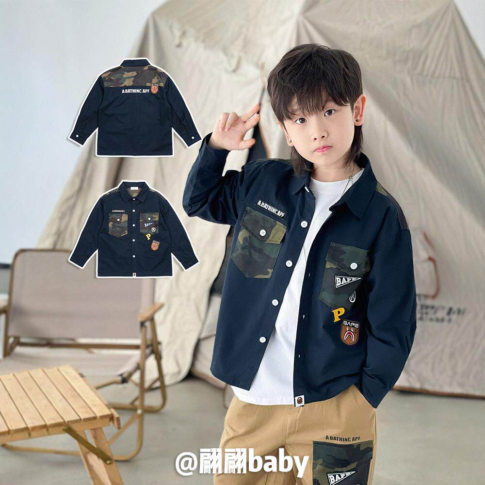 25秋季新款日系潮男儿童装大兜迷彩拼接章仔梭织纯棉长袖衬衫衬衣