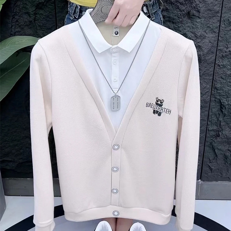 秋季假两件男潮流修身刺绣小熊衬衫领针织衫男士网红社会小伙上衣