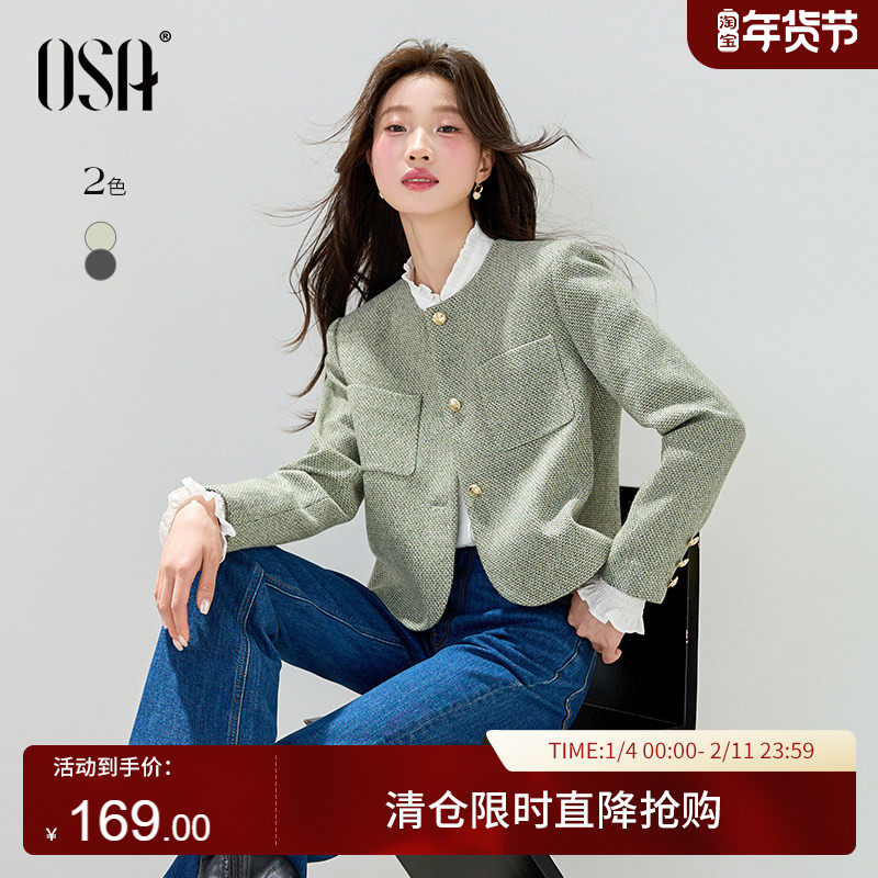 OSA欧莎小香风圆领毛呢外套女复古通勤短款粗花呢子大衣冬季新款