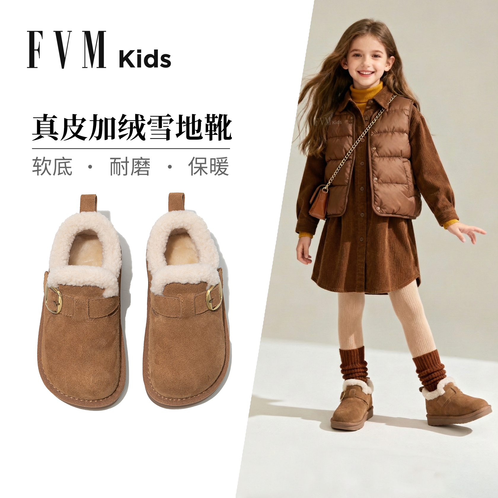 FVM真皮女童雪地棉冬季新款儿童大棉鞋小女孩加绒加厚保暖勃肯鞋