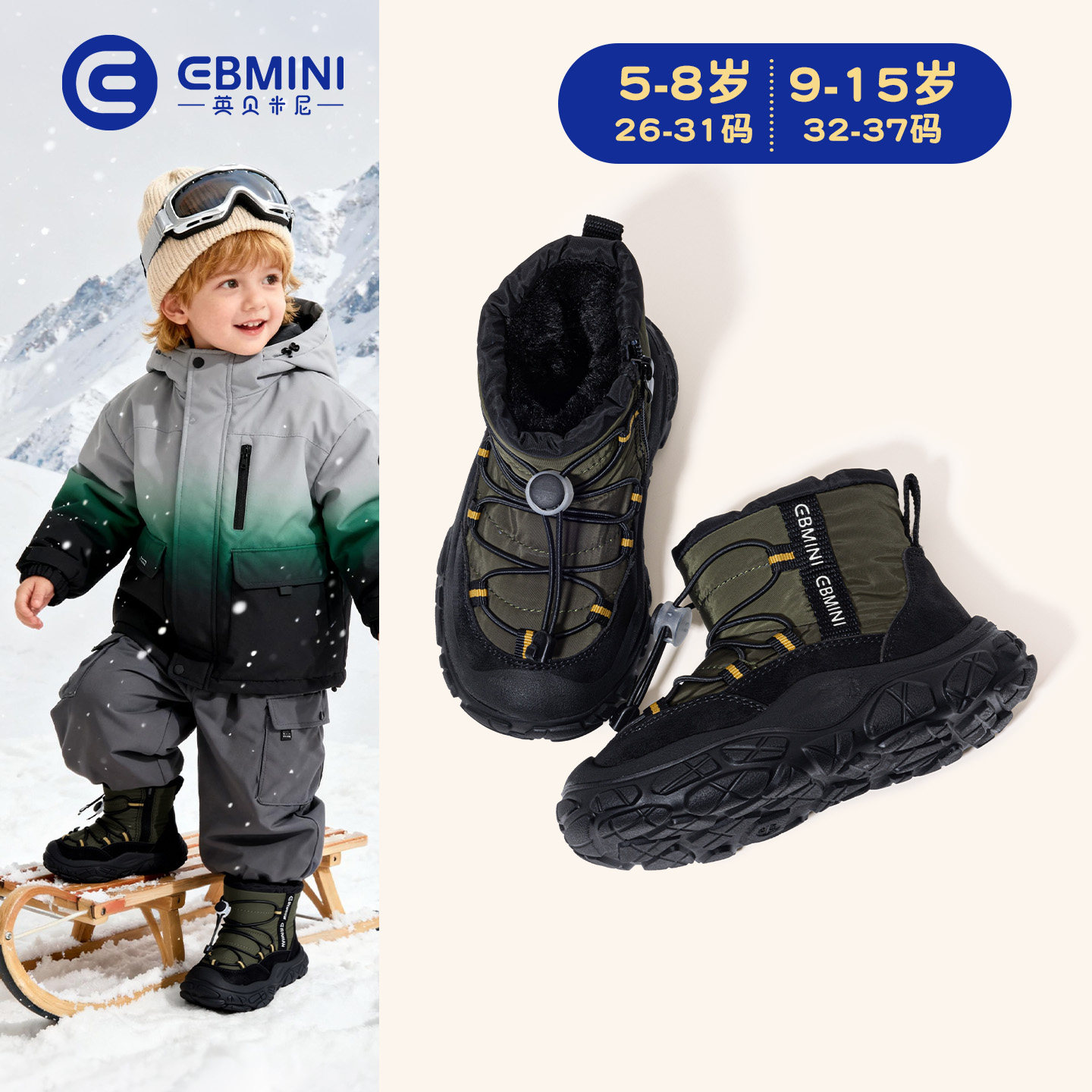 英贝米尼儿童雪地靴冬季2025新款加绒加厚男童棉鞋保暖女童雪地棉