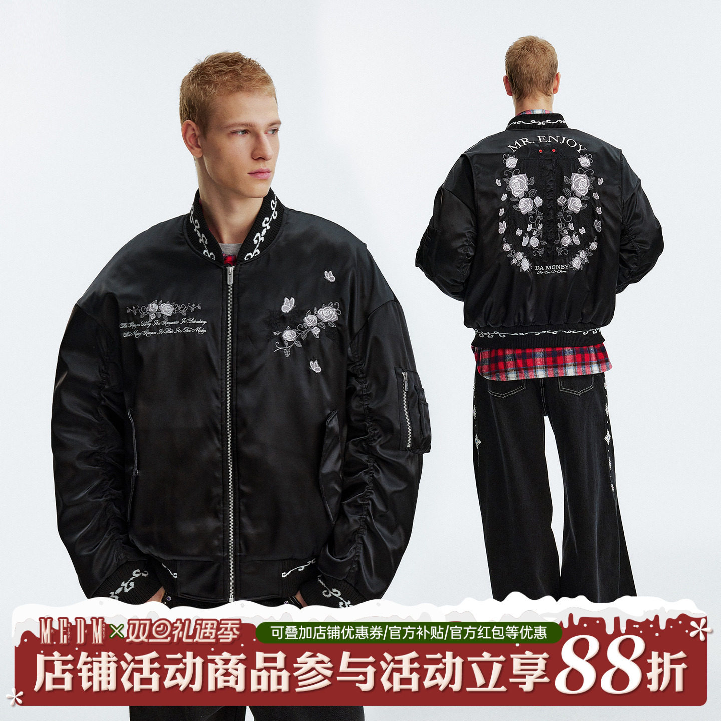 MEDM 玫瑰庄园刺绣ma1休闲棒球领夹克黑色秋冬季美式男女拉链外套