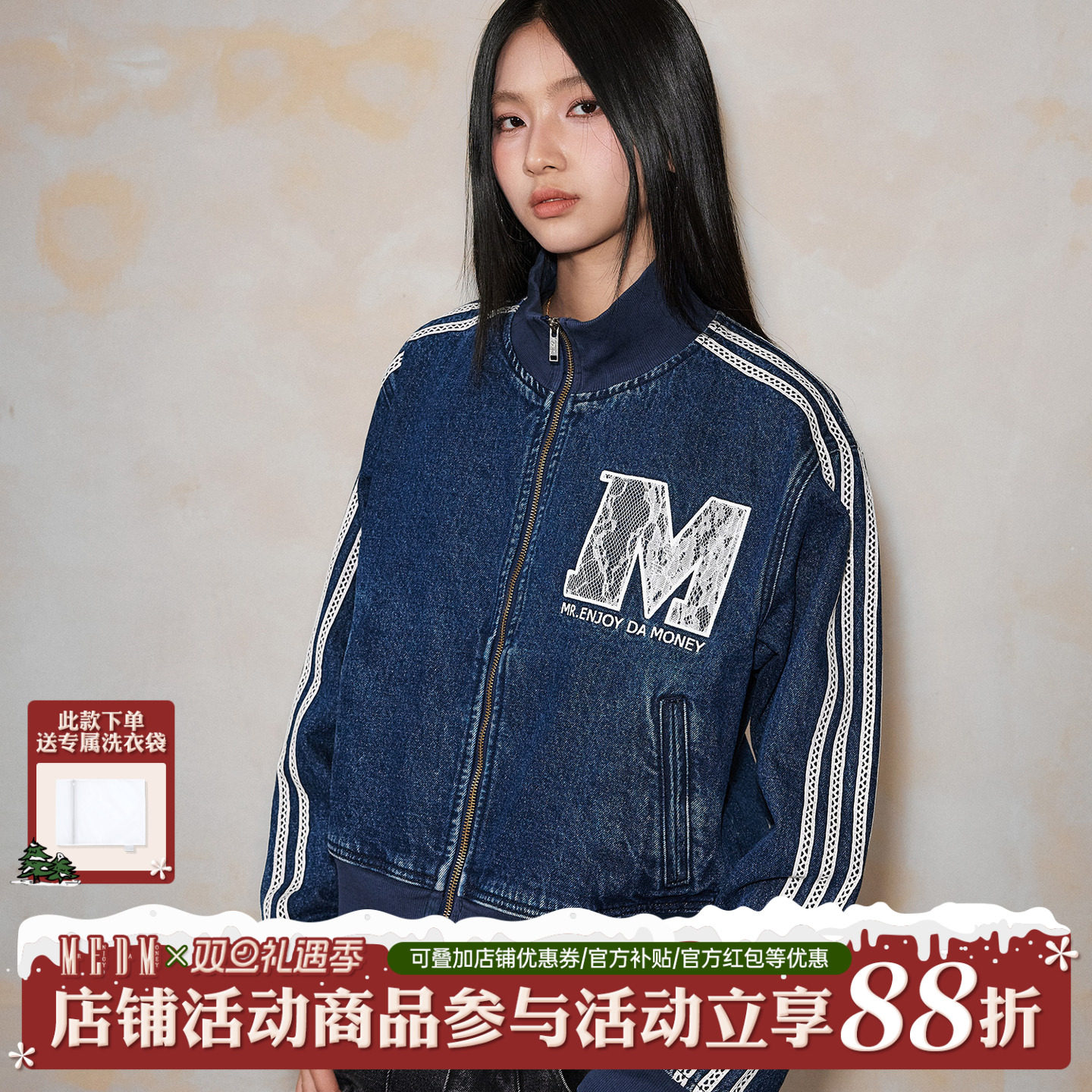 MEDM 蕾丝杠螺纹字母休闲立领牛仔夹克潮流街头宽松情侣拉链外套