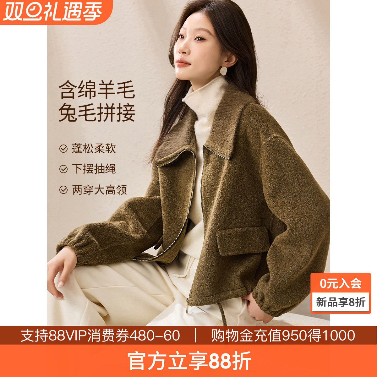 沫晗依美含兔毛拼接双面呢羊毛大衣2025冬季新款邂逅慵懒拉链外套