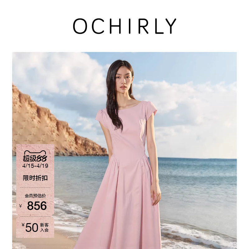 OCHIRLY欧时力 一字领小飞袖A字连衣裙裙子气质度假裙夏