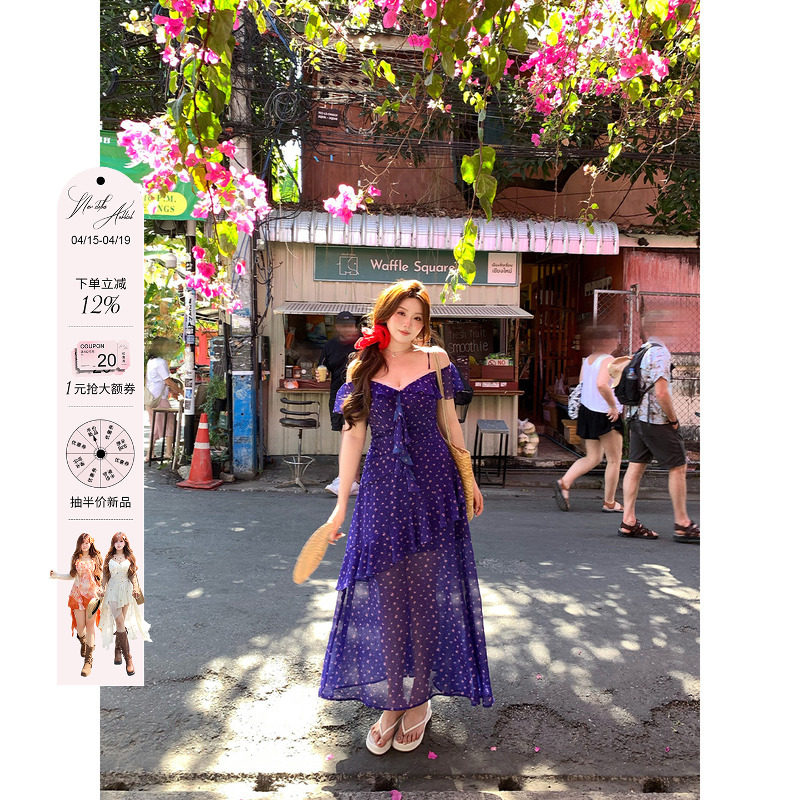 安妮不火 一字肩蕾花边领雪纺印花度假裙女微胖大码收腰吊带长裙