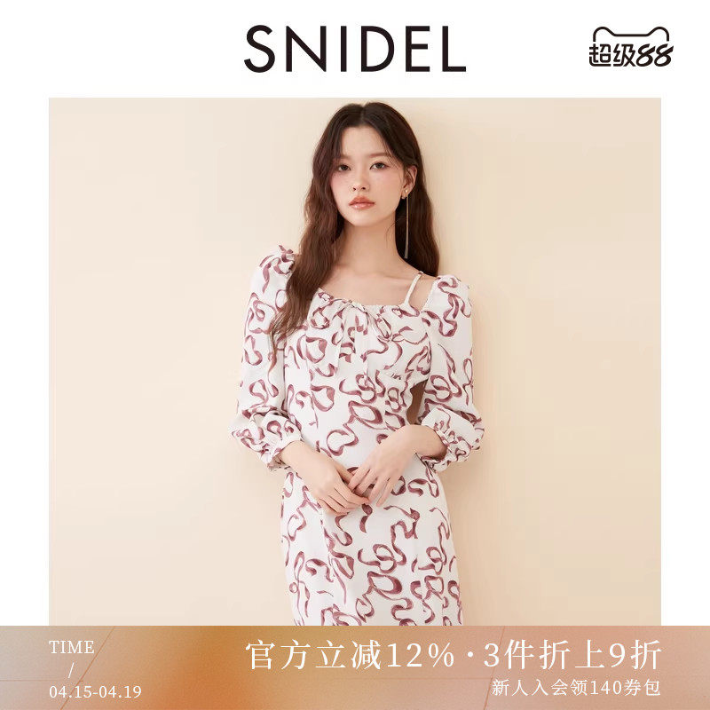 SNIDEL春夏款气质钻石领一字肩蝴蝶结印花连衣裙SWFO251033