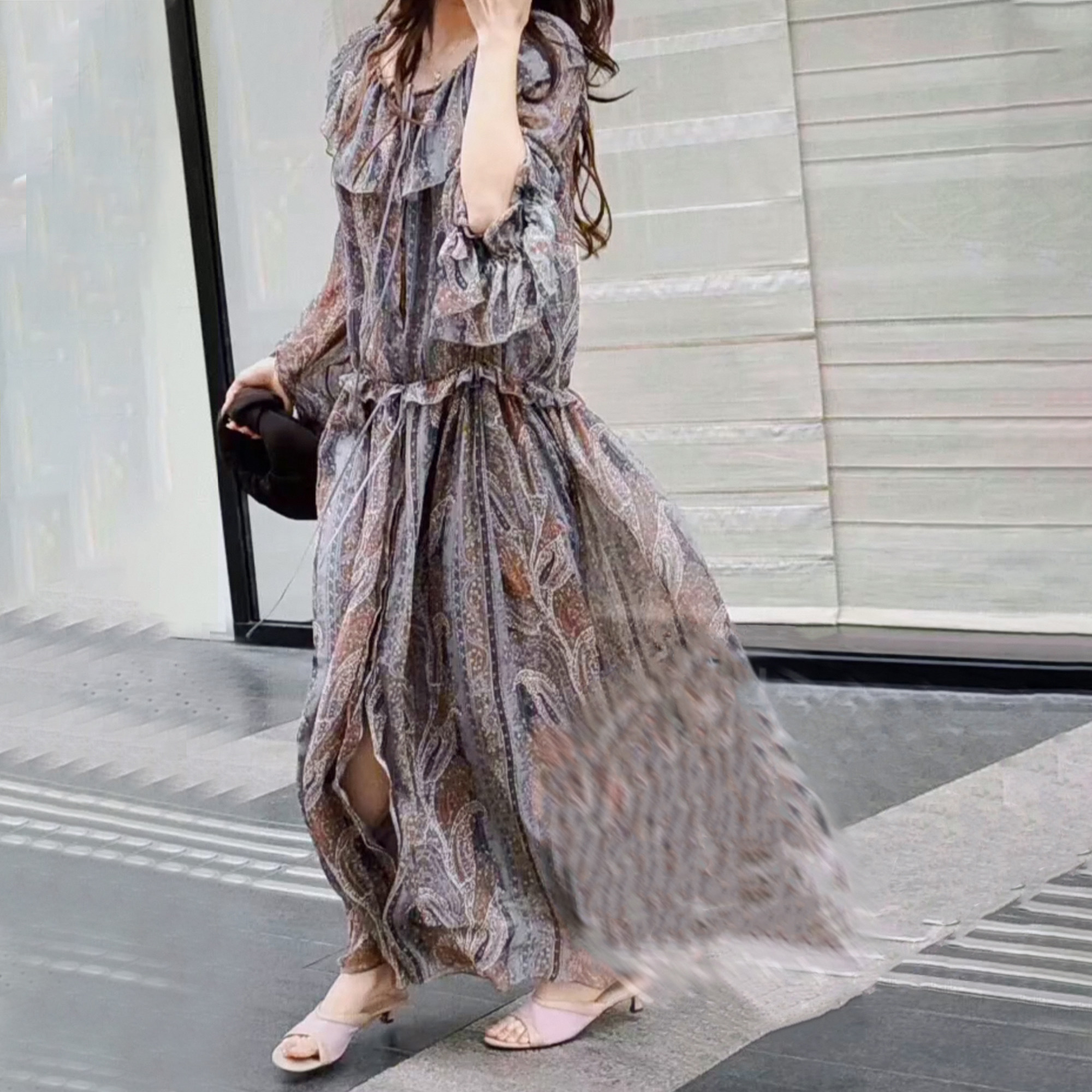 法式复古双层真丝连衣裙 佩斯利印花荷叶边一字领长袖连衣裙 长裙