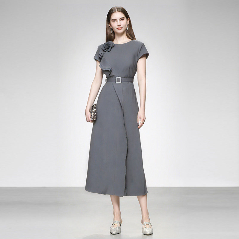 2026夏季新款气质优雅一字领立体花荷叶边收腰A摆长款连衣裙