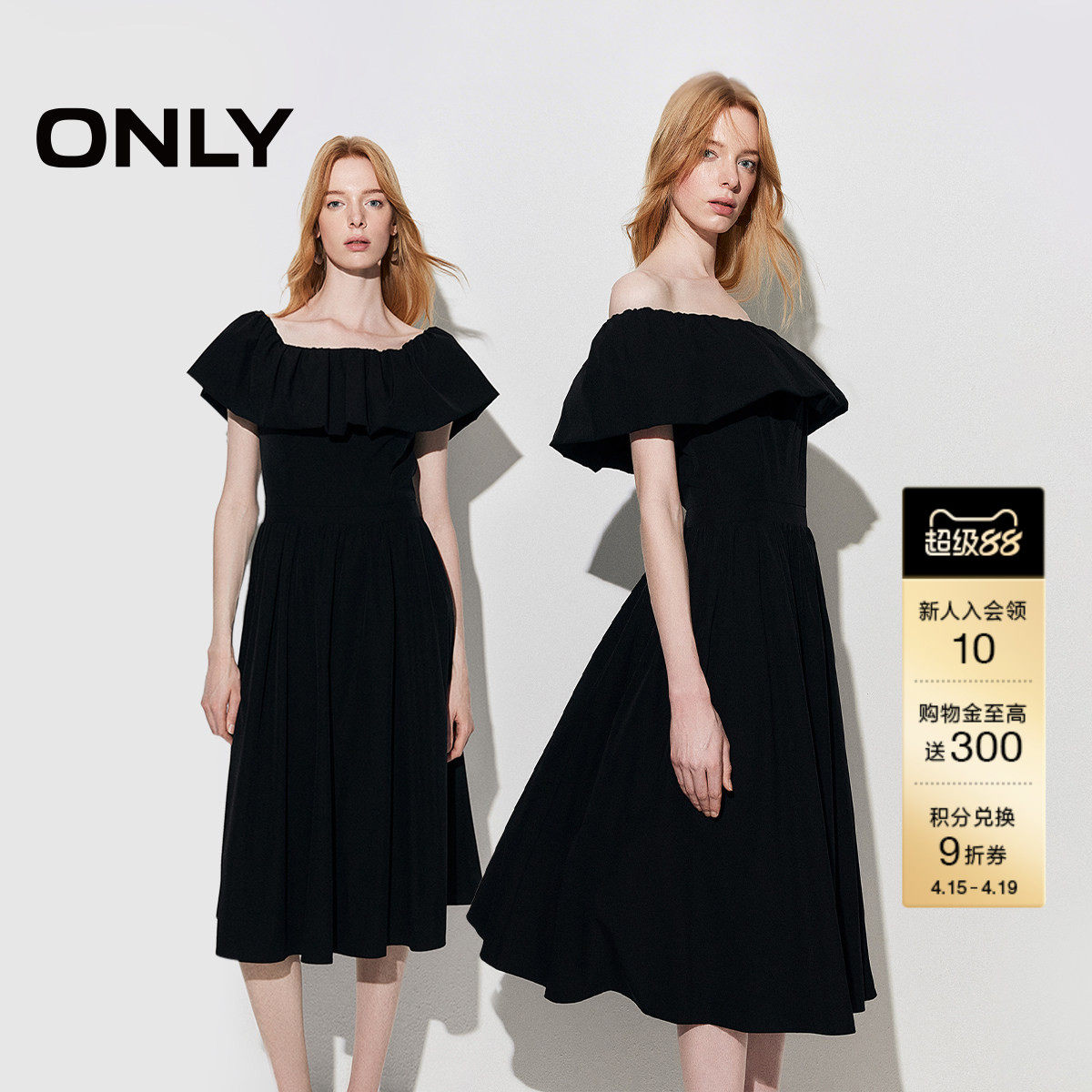 ONLY2026春季新款防滑一字荷叶领收腰捏褶裙摆裙子黑色连衣裙