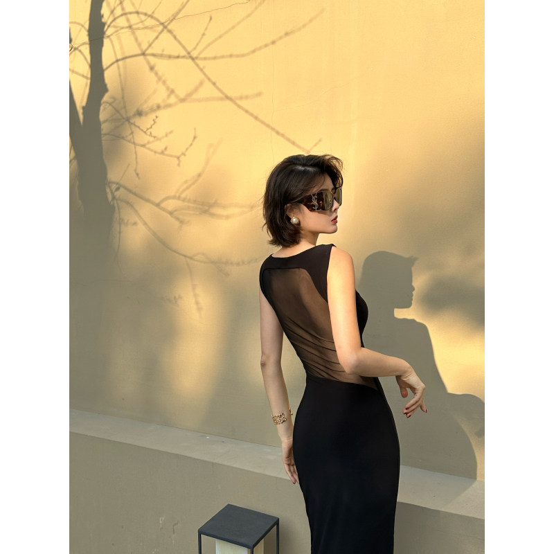 XULU原创春夏水晶麻黑色高阶复古一字领无袖显瘦露背网纱连衣裙