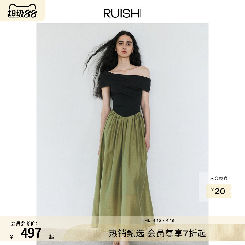 RUISHI芮时“南法假日”莱赛尔混纺撞色拼接气质一字领连衣裙女夏