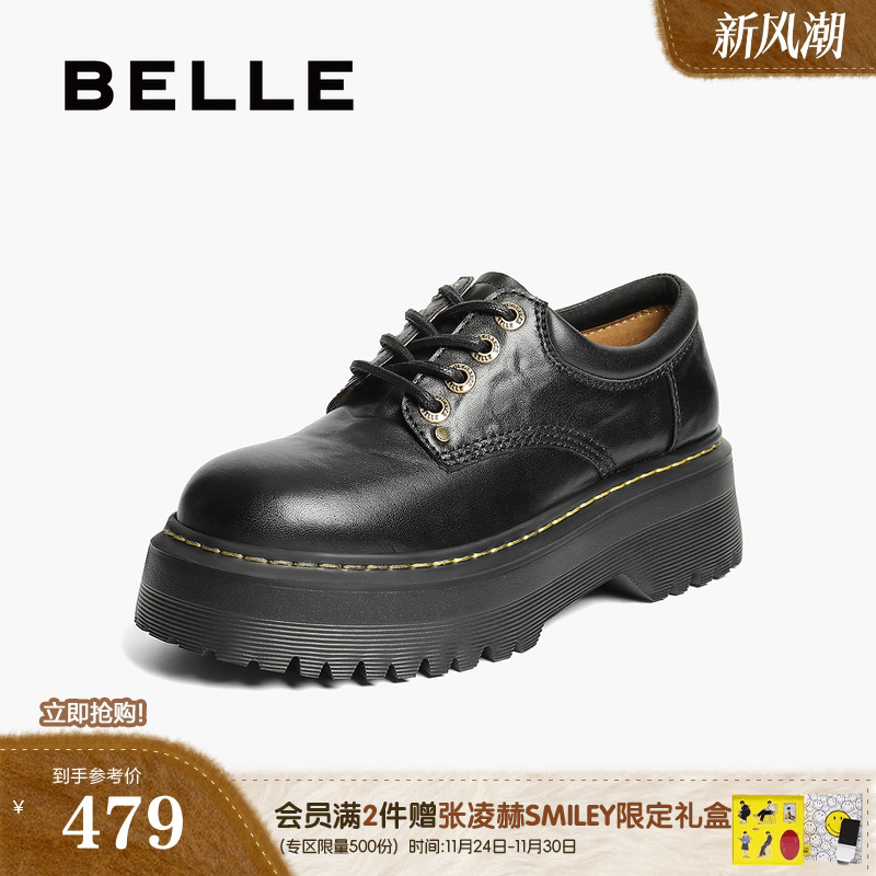 百丽女鞋子厚底牛津鞋女新款乐福黑色小皮鞋深口单鞋子B1Q1DAM4