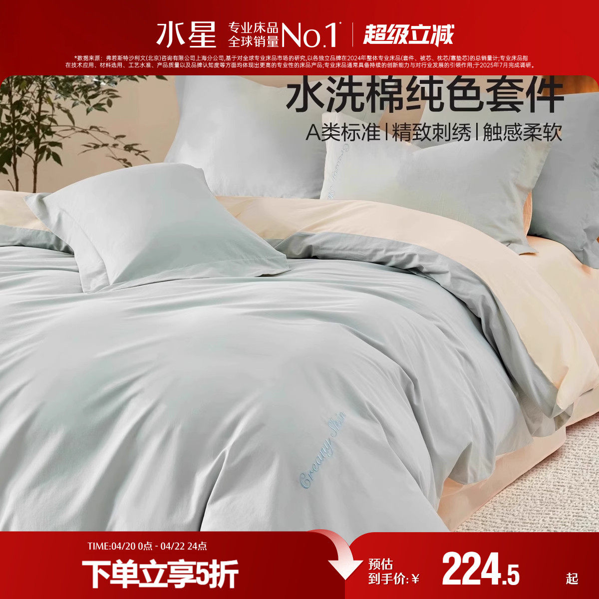 水星家纺A类全棉水洗棉四件套纯棉素色简约套件家用被套床单床品