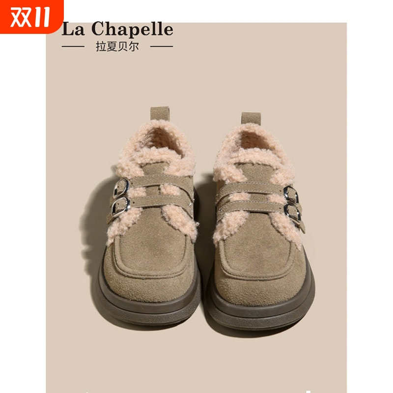 拉夏贝尔加绒勃肯鞋女2025年秋冬小皮鞋女加绒保暖棉鞋厚底毛毛鞋