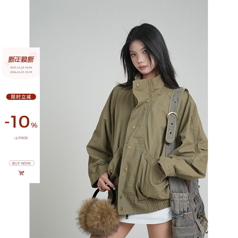 爱情魔鬼鱼 军绿色立领牛仔短外套女2025年秋冬新款宽松休闲上衣