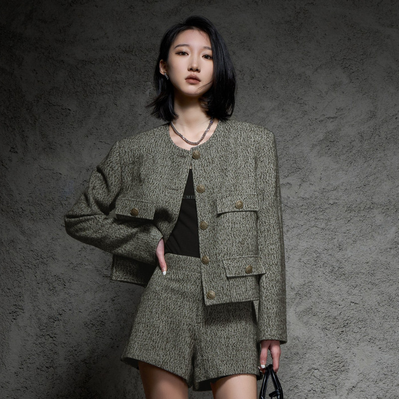 U/TI军绿色复古粗花呢外套女百搭小香风休闲上衣尤缇时尚秋季新款