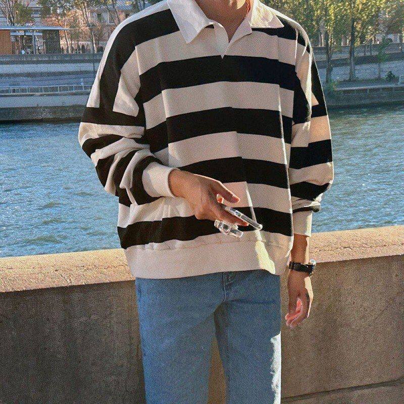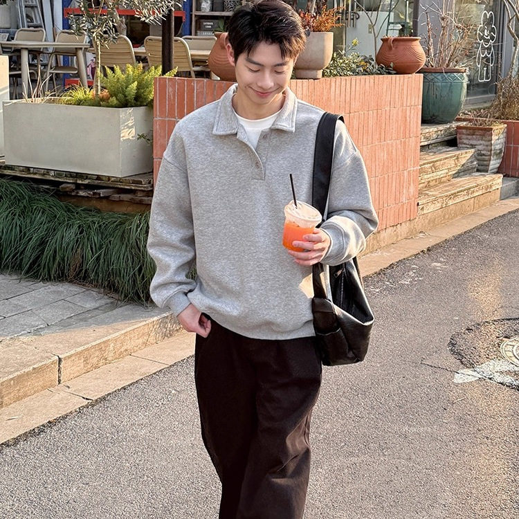 日系翻领灰色卫衣秋季宽松百搭休闲POLO衫套头简约韩版纯色上衣潮