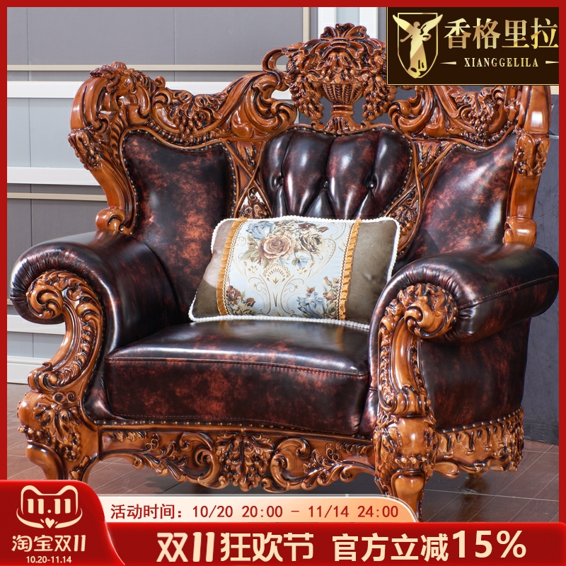 欧式真皮沙发美式奢华别墅复古1234组合沙发实木雕花大气皮艺沙发